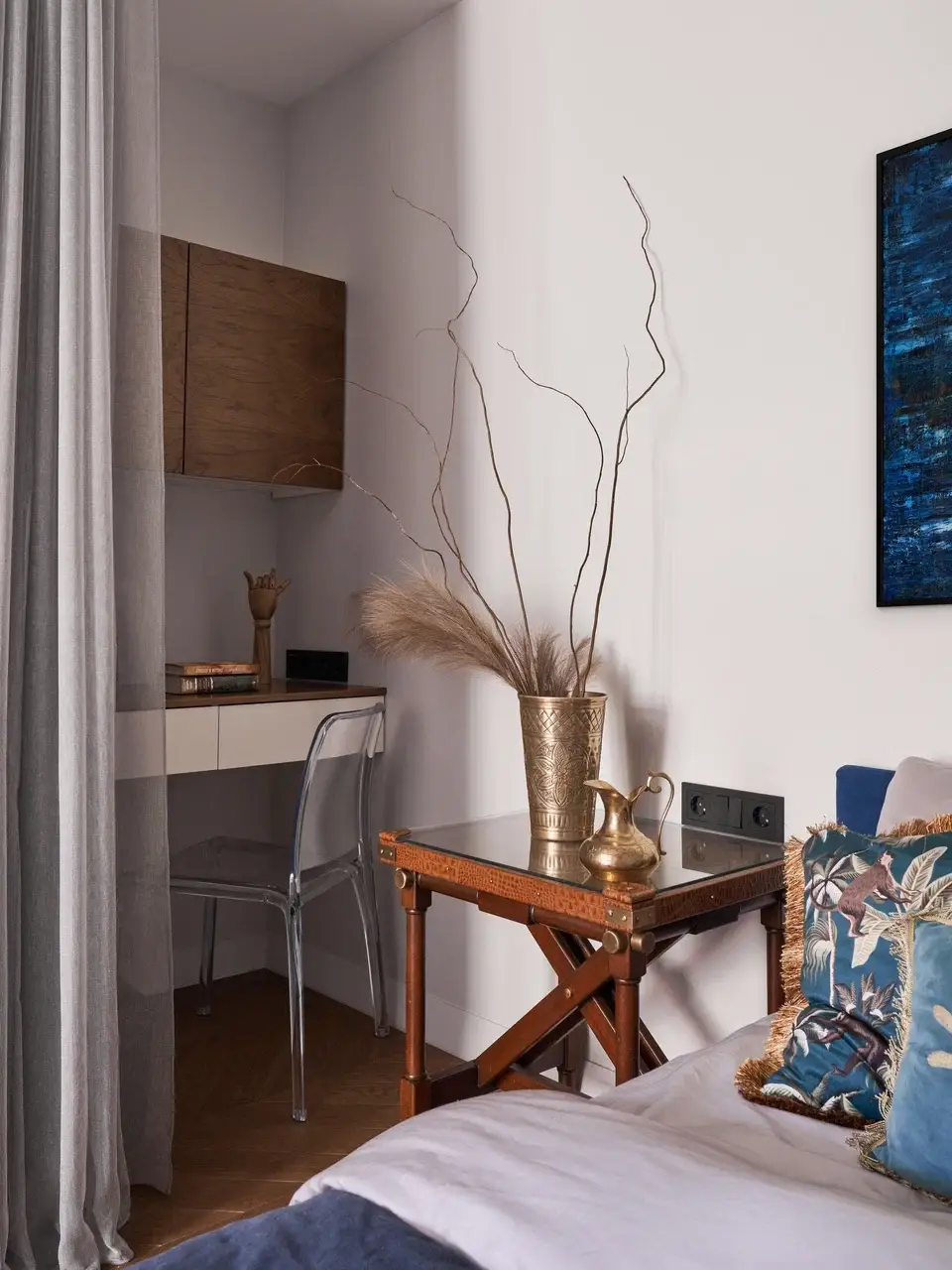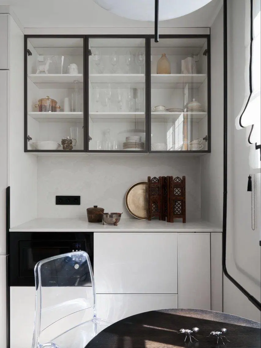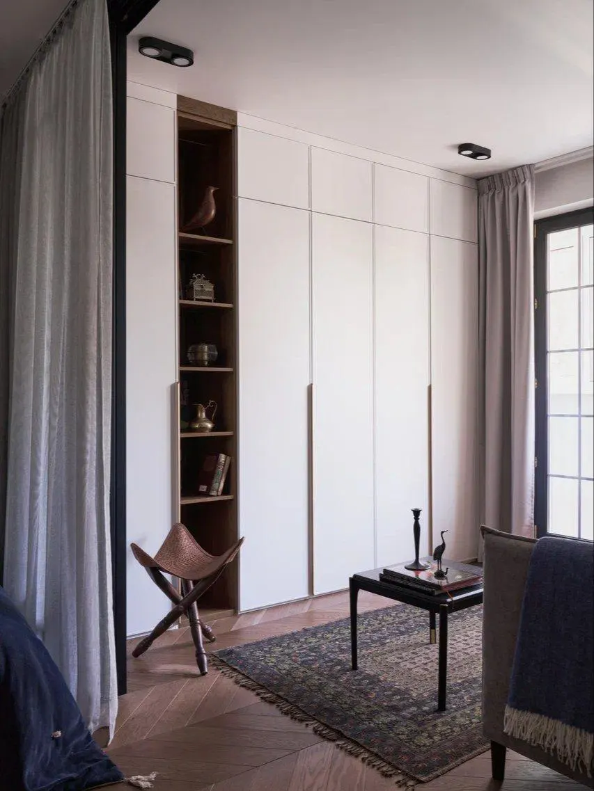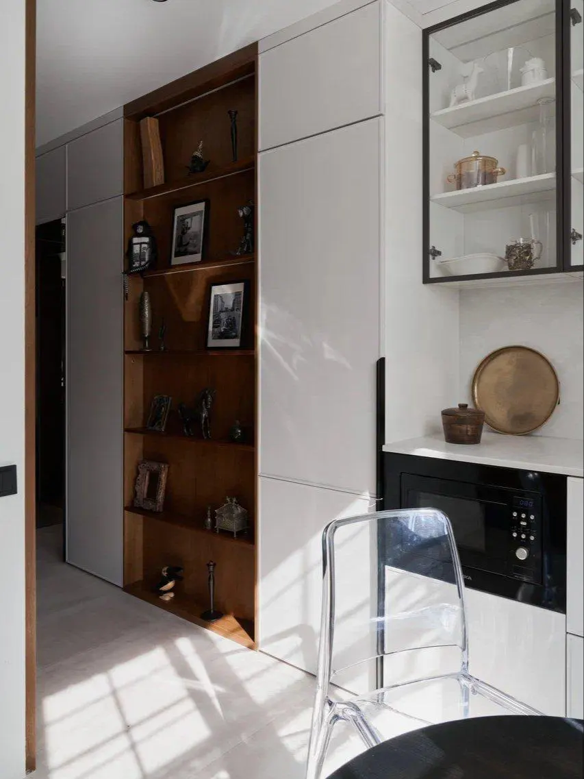 «При проектировании это место мы запланировали под вещи заказчицы, которые так дороги ее сердцу. Некоторые предметы декора сохранились с ее юных лет и несут в себе массу воспоминаний. Именно это место самое проходимое в квартире», — объясняет свою задумку дизайнер.