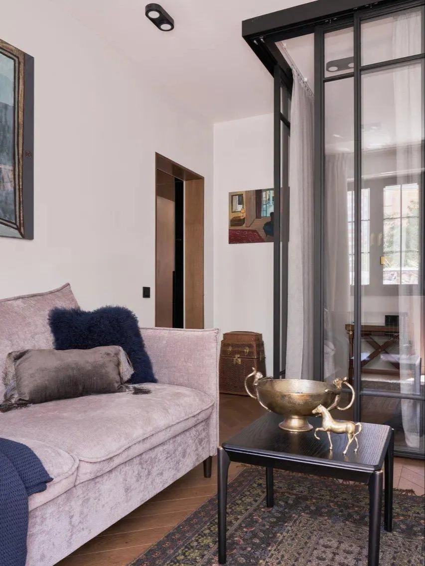Хозяйка привыкла жить в просторной квартире с отдельной спальней. Помимо этого у нее часто гостят дети и внуки. Было принято решение отделить спальное место с помощью стеклянных перегородок и полупрозрачных штор. Если придут гости, то это помещение можно будет зашторить и изолировать.
