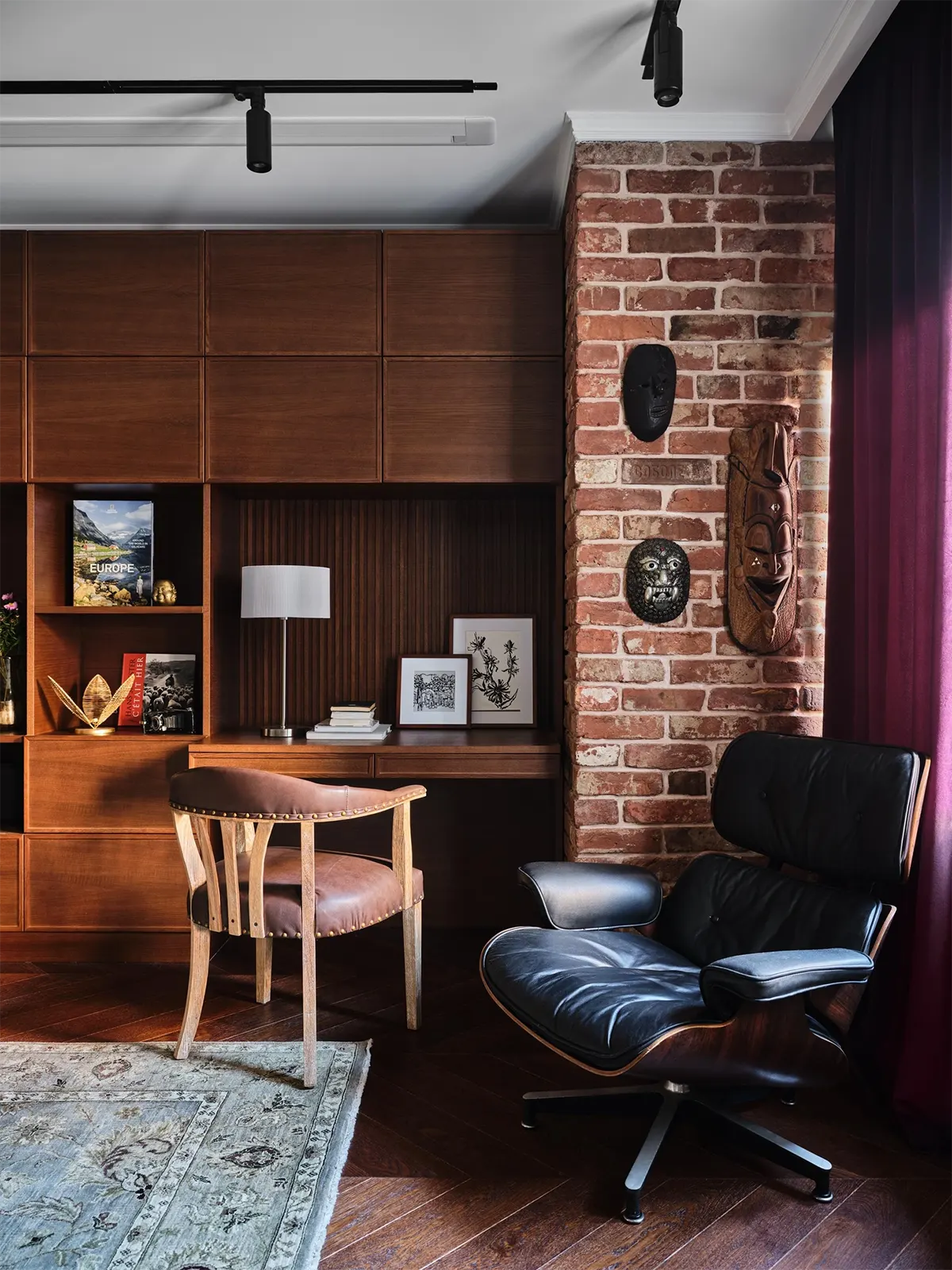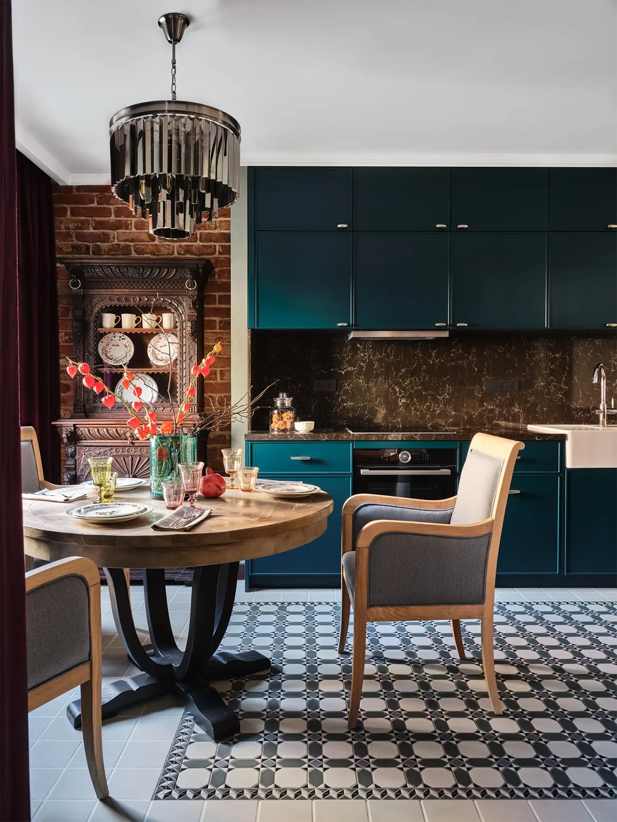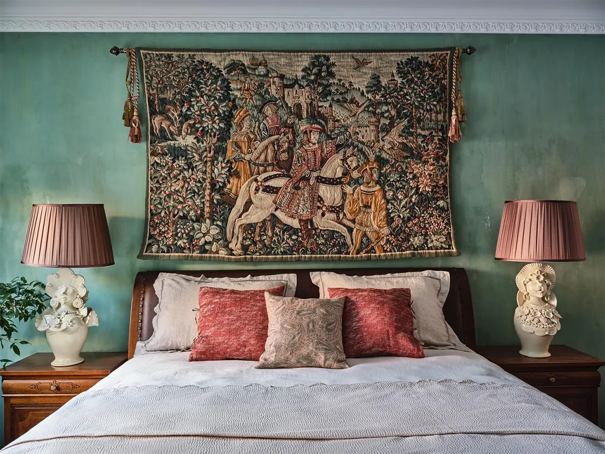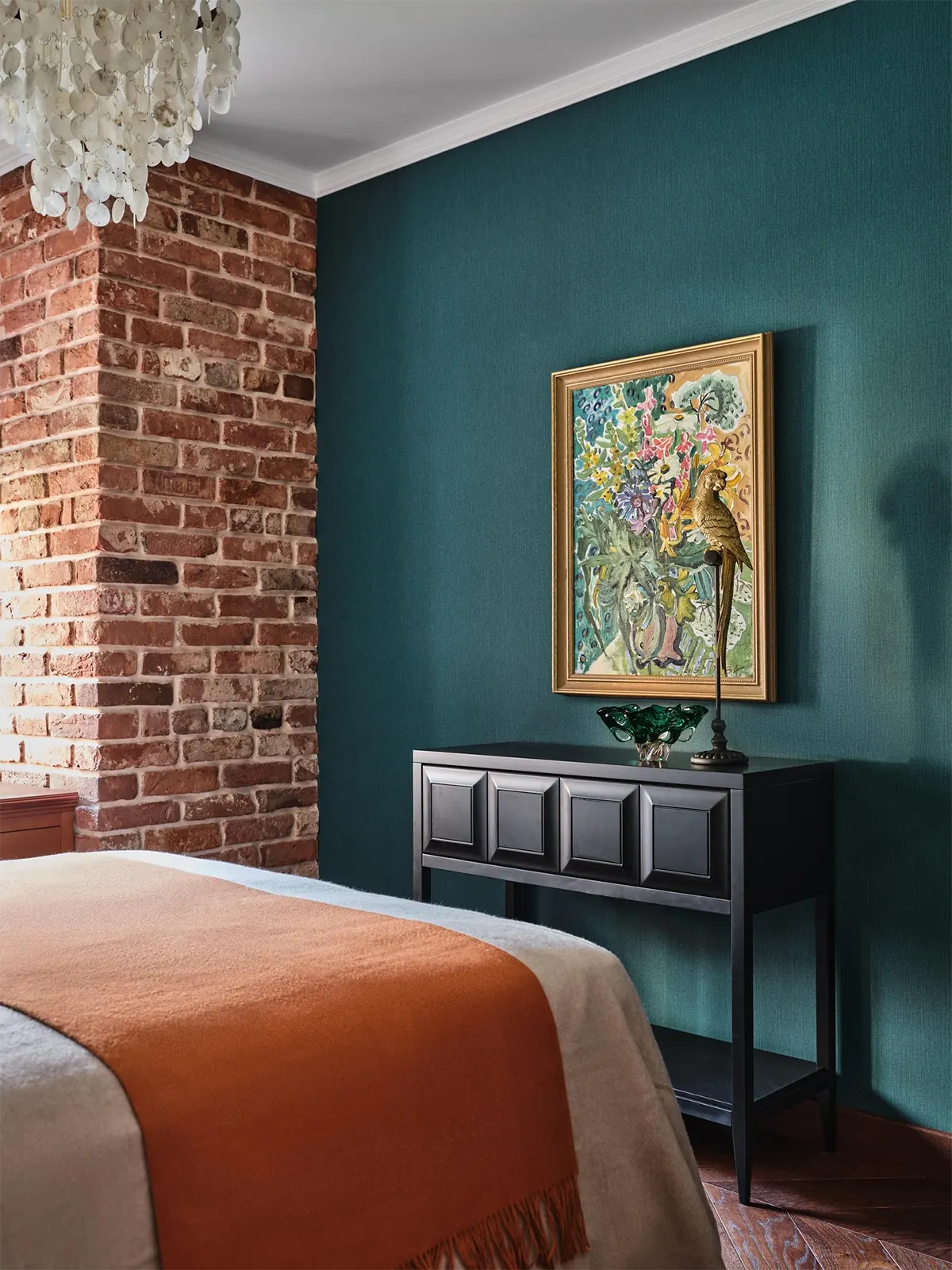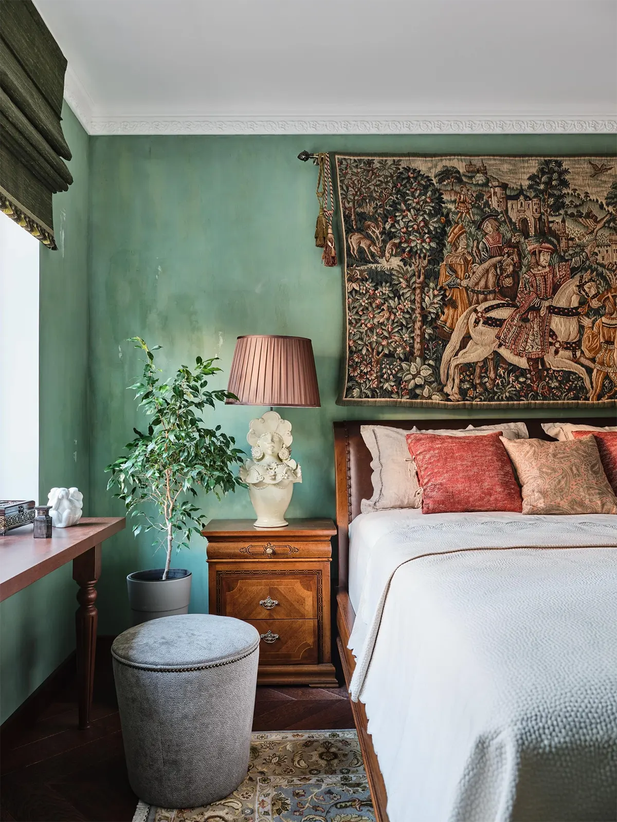Здесь много зеленого цвета и вещей с блошиного рынка. Кое-что покупали на Авито. Антикварный буфет на кухне привезли из Франции. Кресло Eames 1950-х годов выкупили у коллекционеров. Винтажный гобелен над кроватью нашли на Ebay.