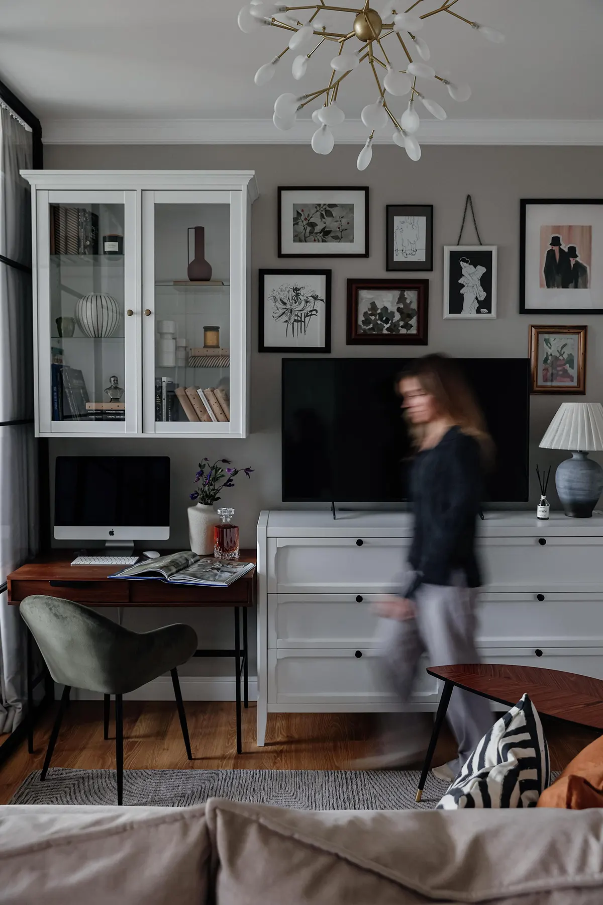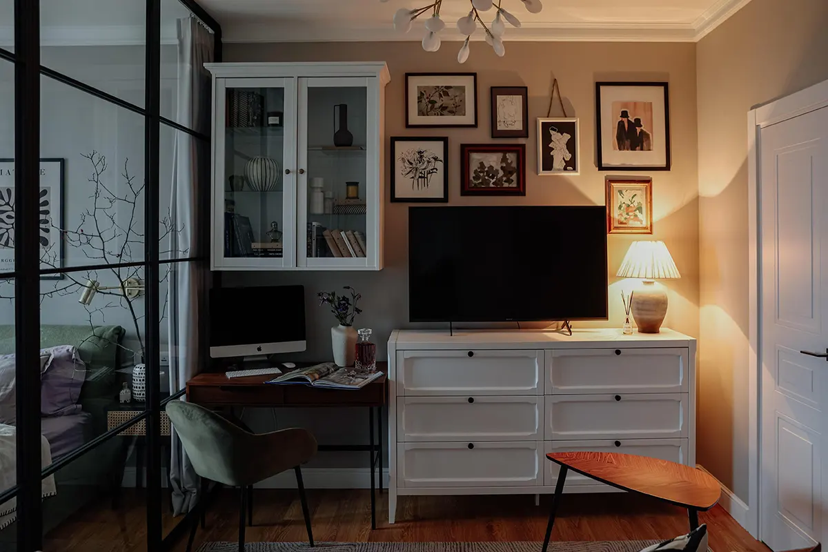 Интерьер этой квартиры в одной из новостроек Москвы пришлось продумывать с нуля. Нынешним владельцам она досталась с типовым ремонтом от застройщика. На тот момент это была коробка-студия площадью 40 квадратов, без отдельной спальни и кухни.