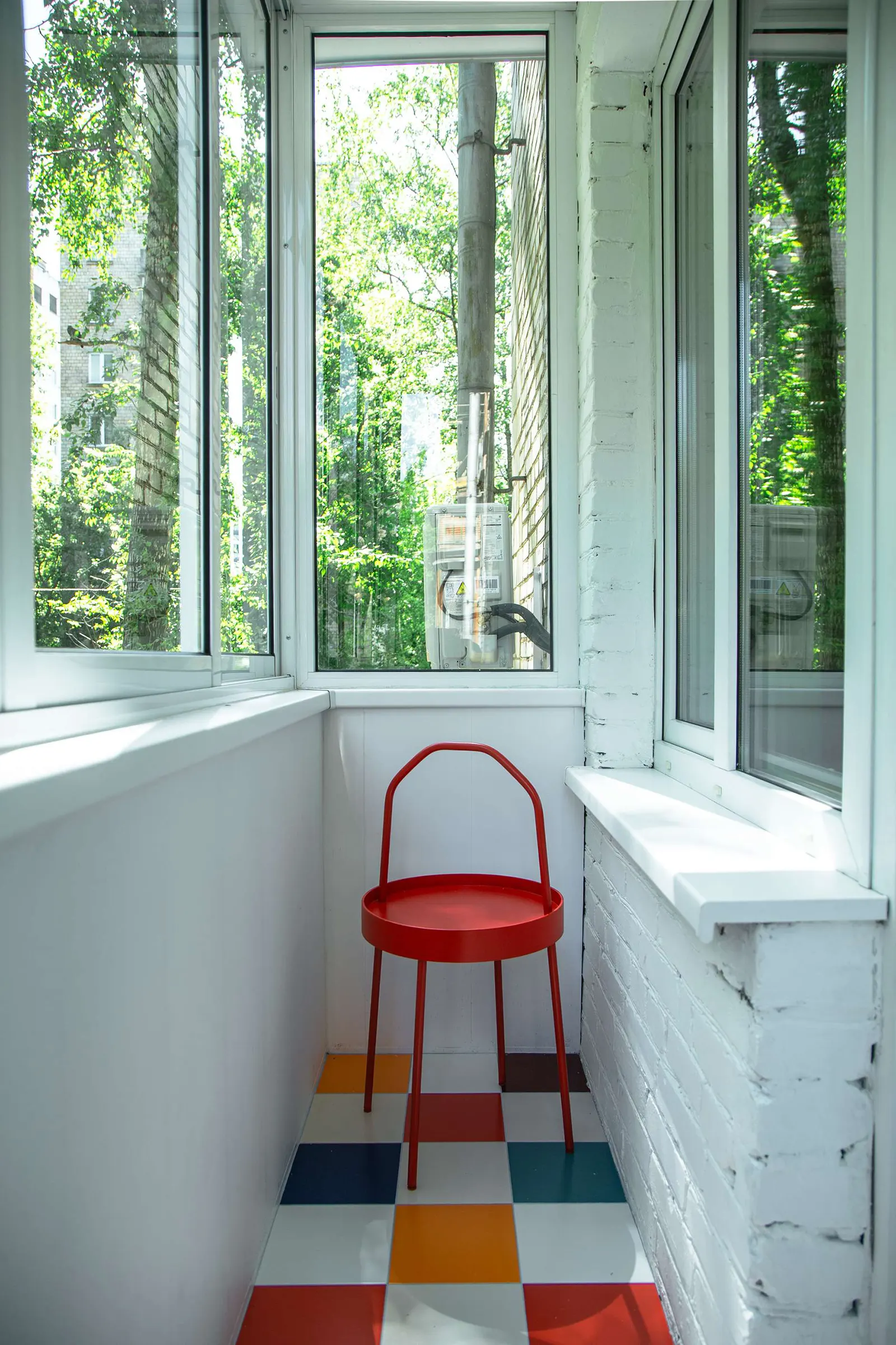 Так выглядит балкон. На столь крохотном пространстве не разбежишься с идеями, но Павел Фотеев сумел добавить яркости даже тут. На пол он в шахматном порядке положил разноцветную плитку, которая осталась после ремонта санузла.