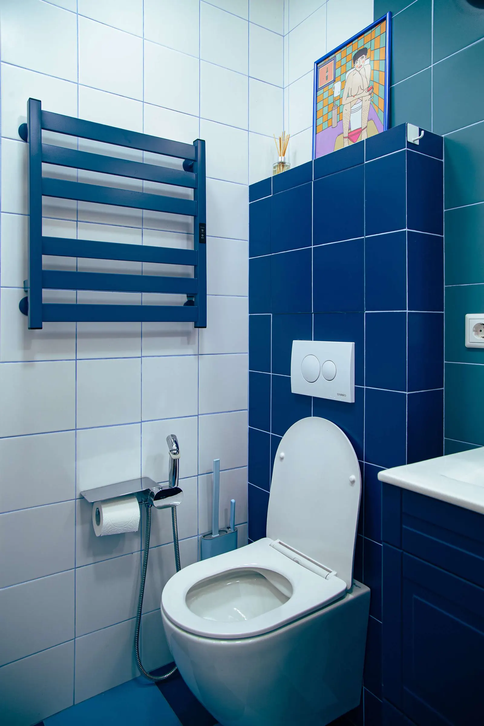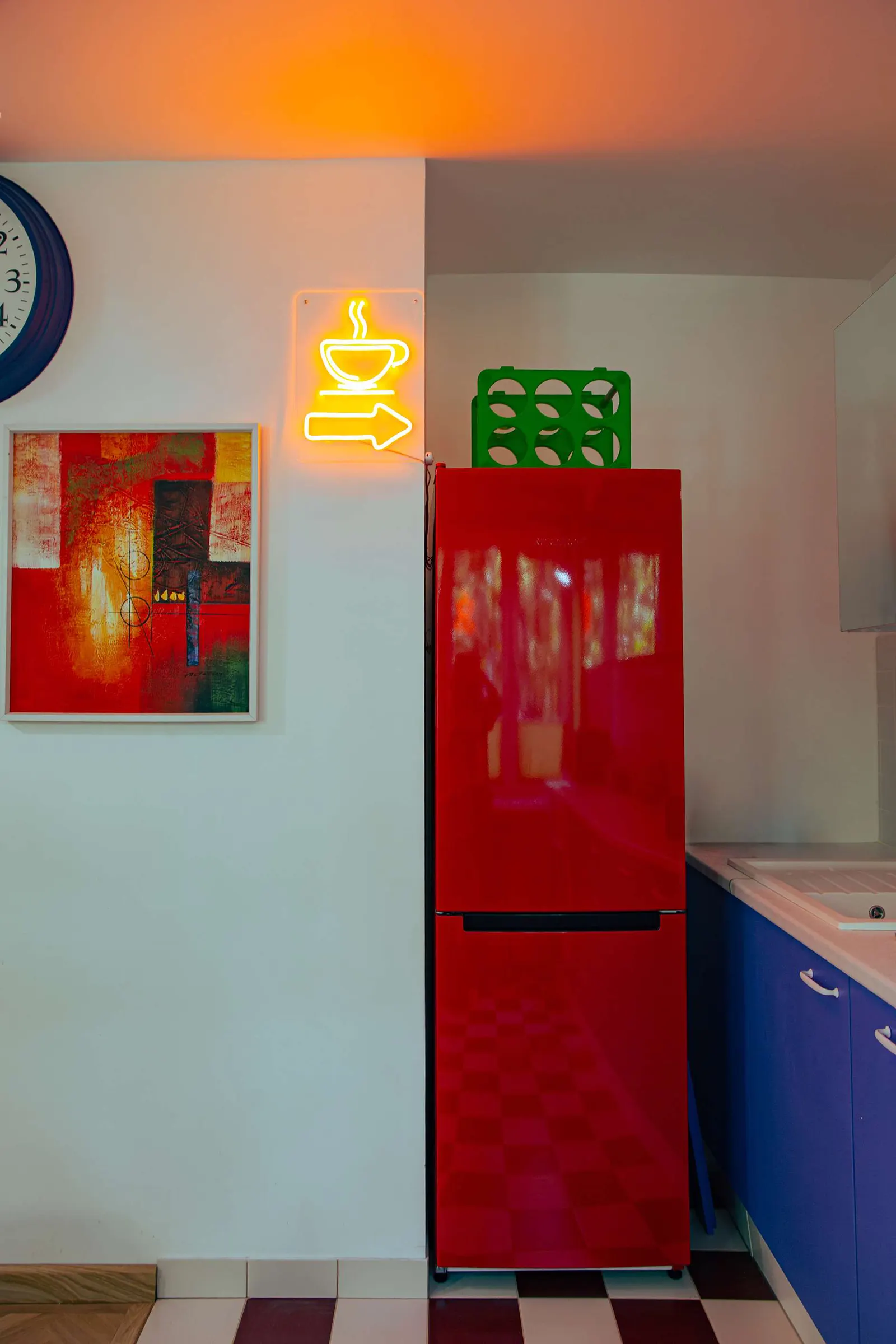 Красный холодильник (его покрасили самостоятельно) установили в нишу, которая образовалась при расширении санузла.