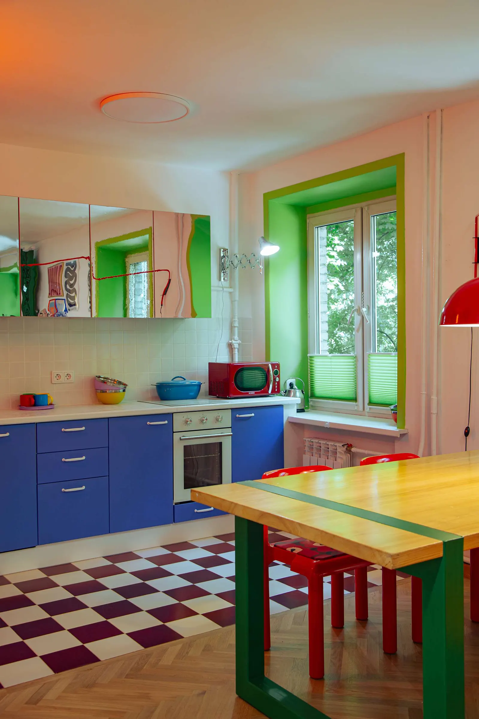 Кухня сразу приковывает к себе внимание. Шахматный пол, кухонный гарнитур в двух оттенках (фасады верхних шкафов оклеены зеркальной пленкой) и зеленые откосы окон.