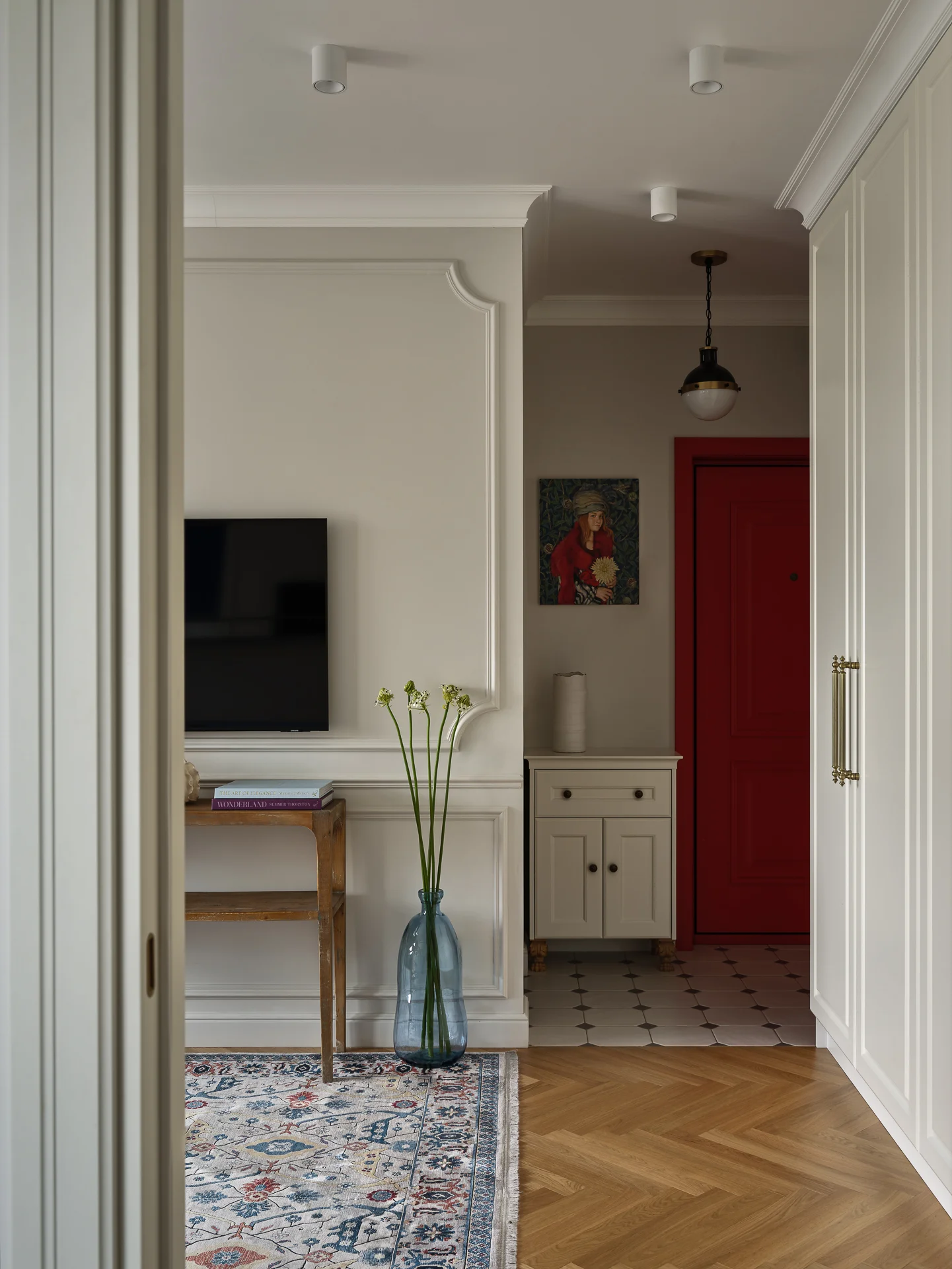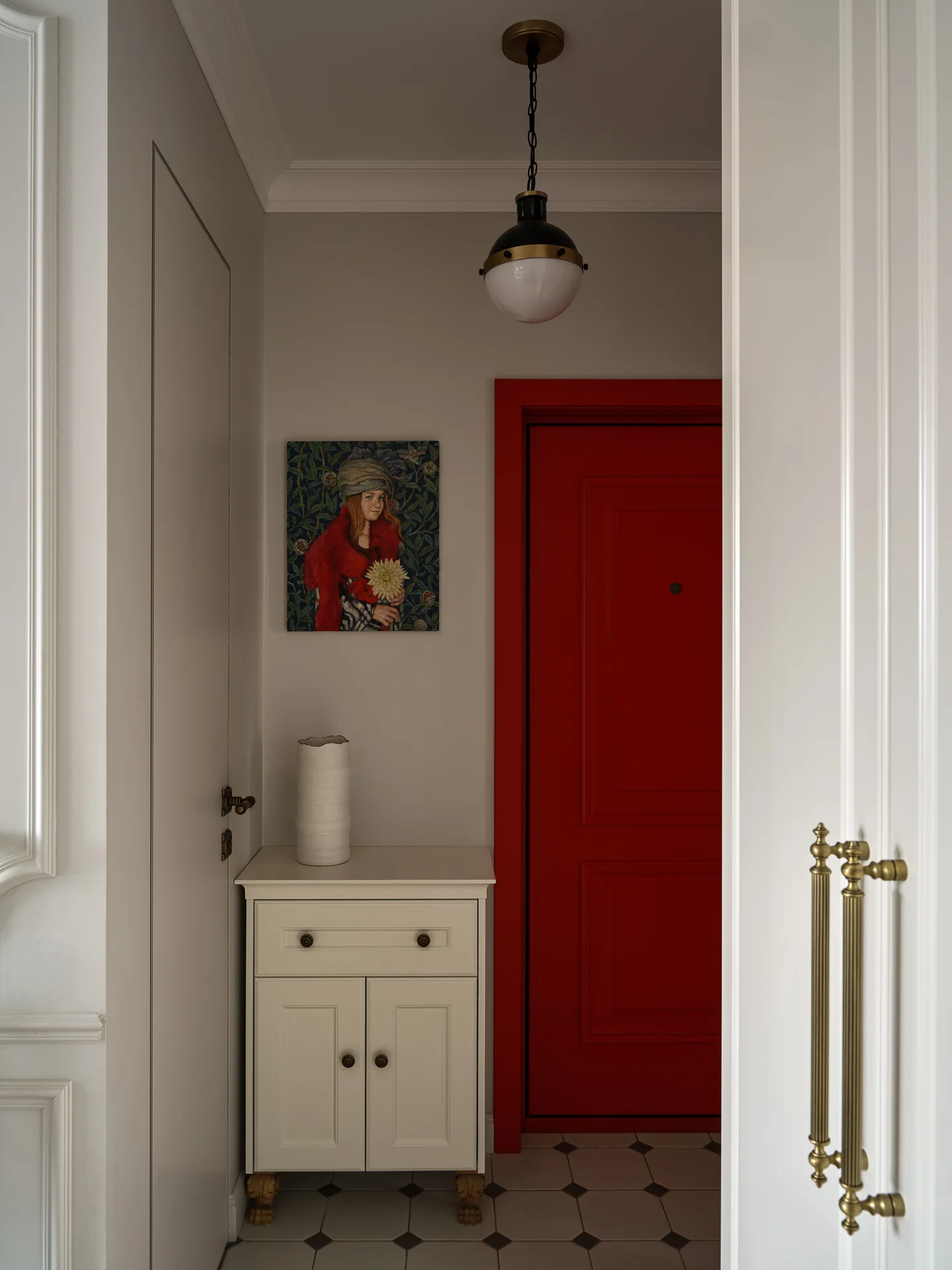 Красная дверь в прихожей — одно из пожеланий хозяйки квартиры. При этом она выбрала классический красный оттенок — как цвет помады. В результате эта идея отлично вписалась в будущий интерьер квартиры. Яркая дверь притягивает на себя внимание и задает тон всей обстановке.