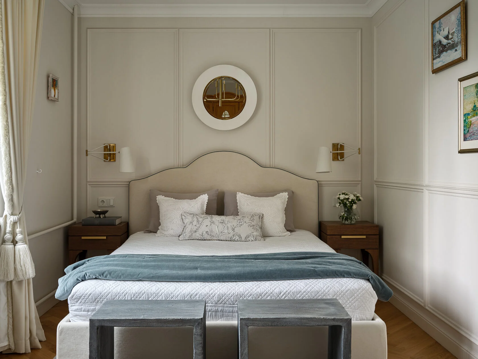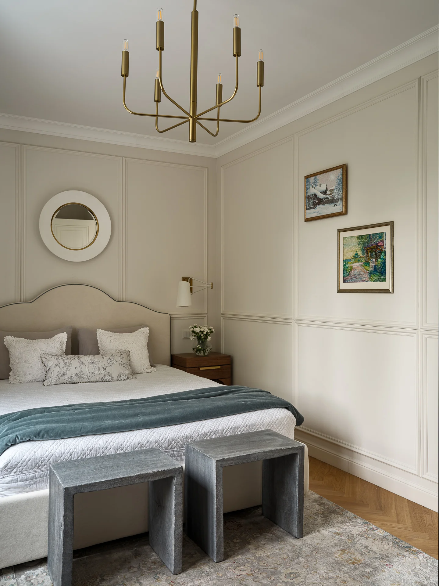 Вместо обоев с орнаментом дизайнер выбрала молдинги, которые добавили дополнительный объем этой компактной спальне.