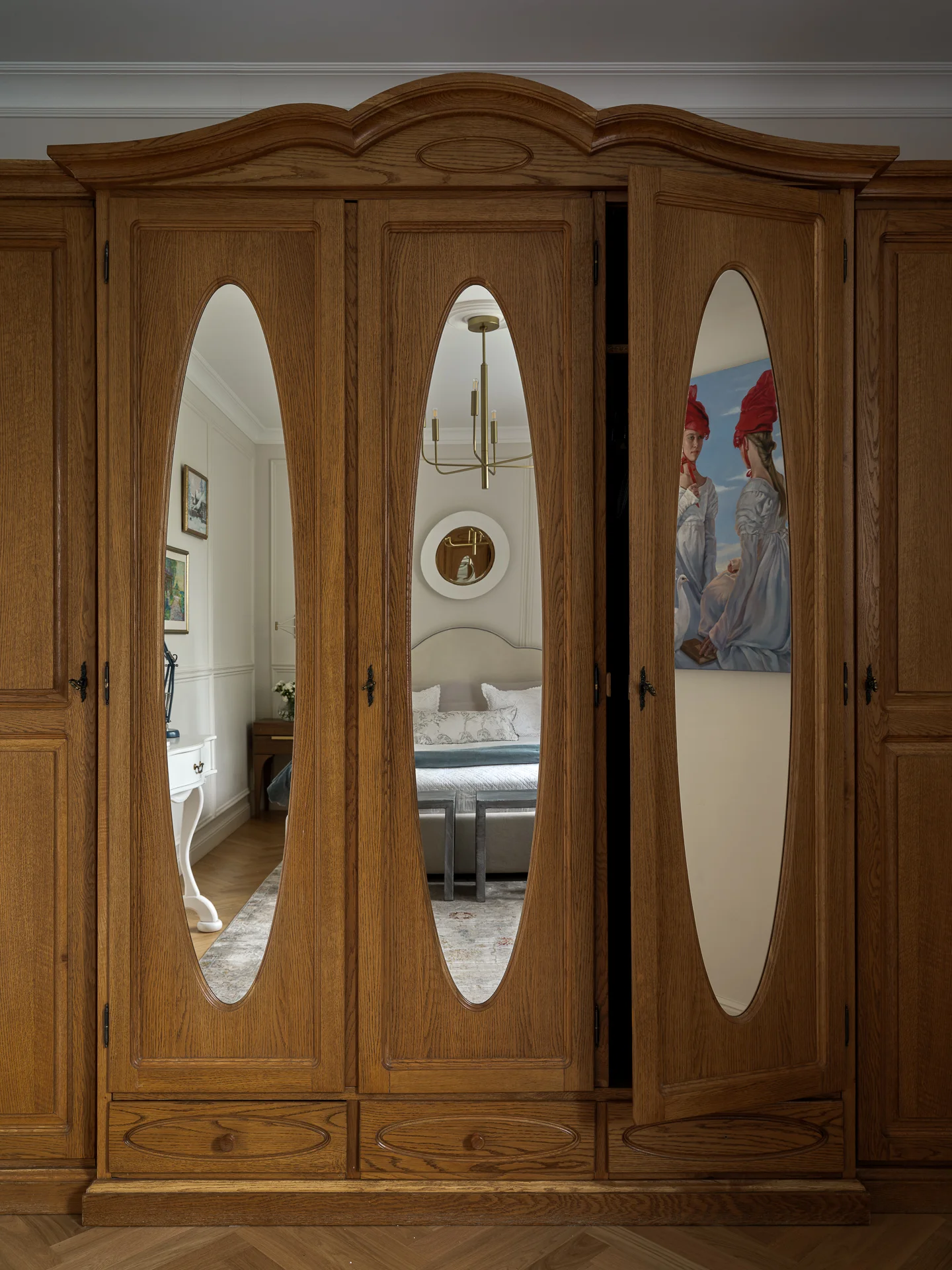 Настоящим украшением спальни стал большой винтажный дубовый шкаф, где хранится одежда хозяйки. Еще в самом начале сотрудничества с дизайнером она попросила каким-то образом интегрировать этот предмет мебели в будущий интерьер квартиры.