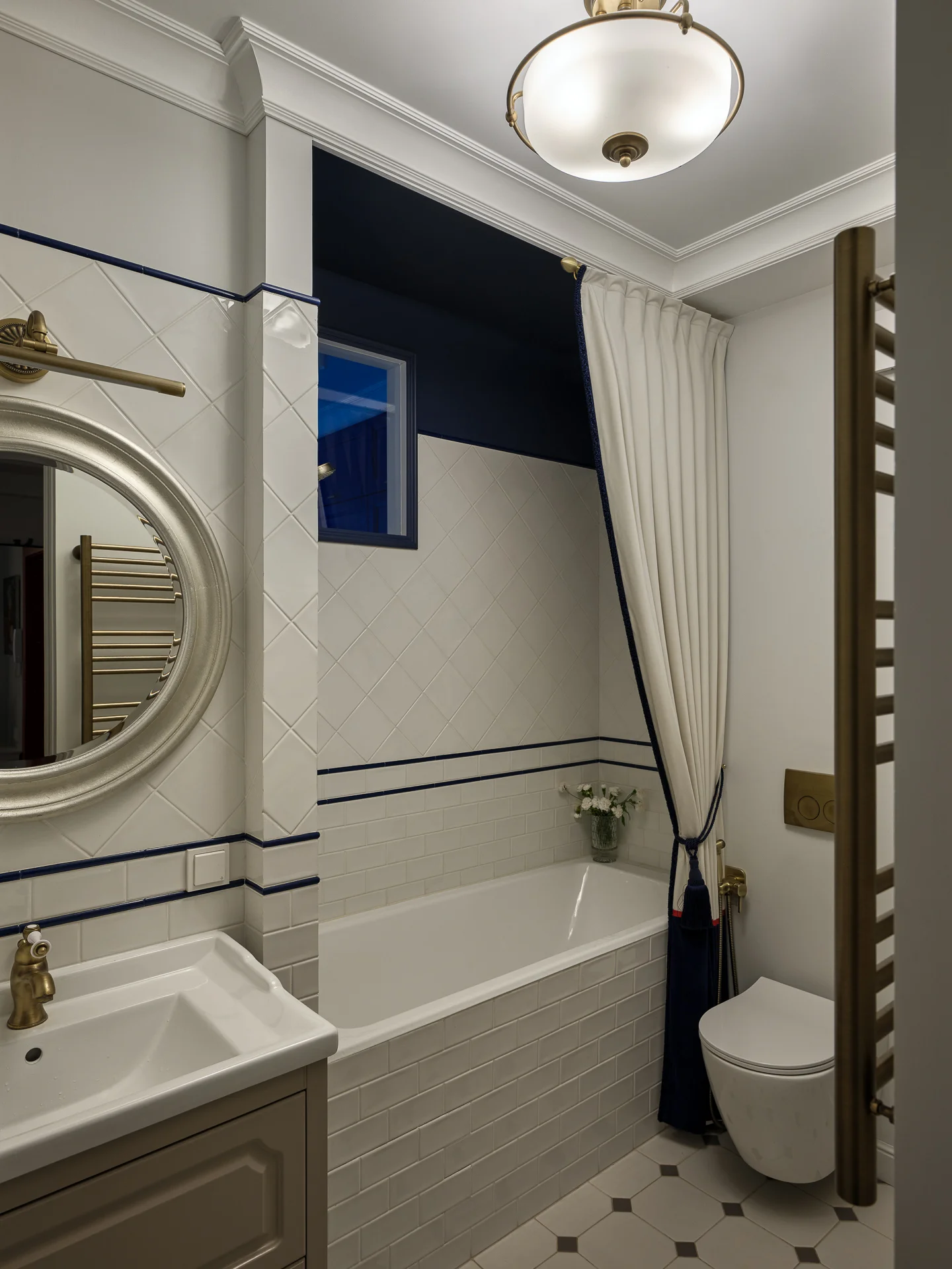 Штора из велюра — декоративный элемент. Она обыкновенная, не предусмотрена для защиты помещения от капель воды (обратите внимание на карниз, он всего длиной около полуметра). Эту штору сшили на заказ из трех тканей. Нижняя часть перекликается по цвету с верхней частью стены. Но при этом чуть выше карниза, в нише, есть направляющая, на которую при желании можно будет повесить классическую шторку для душа.