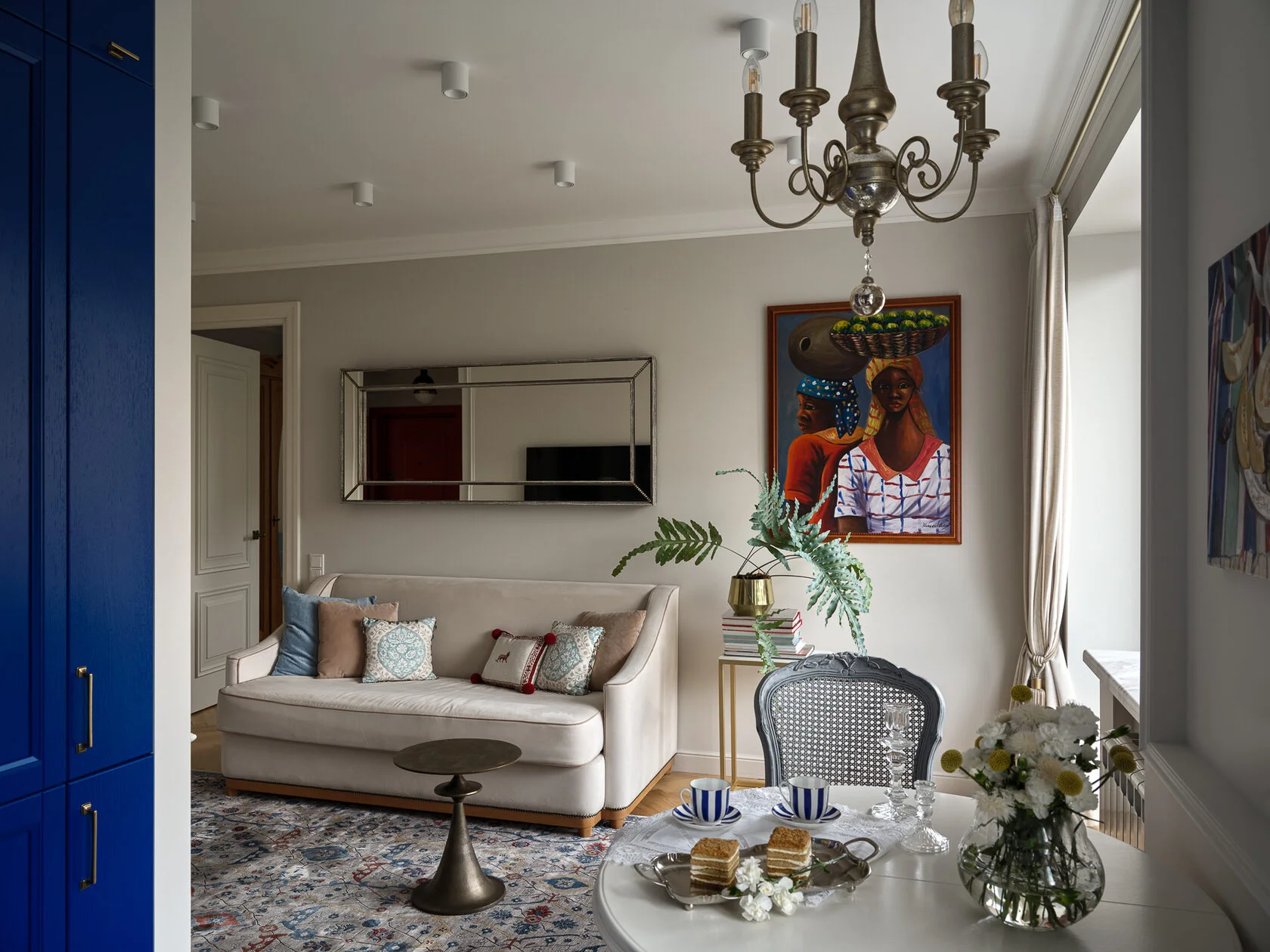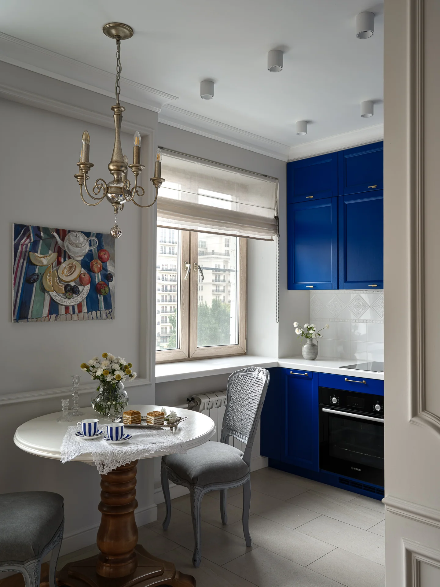 Обеденная зона частично находится в гостиной. Для холодильника за счет бывшего коридора выделили специальную нишу. Получилась компактная и красивая кухня в средиземноморских оттенках. Акцентный синий цвет преобразил все помещение.