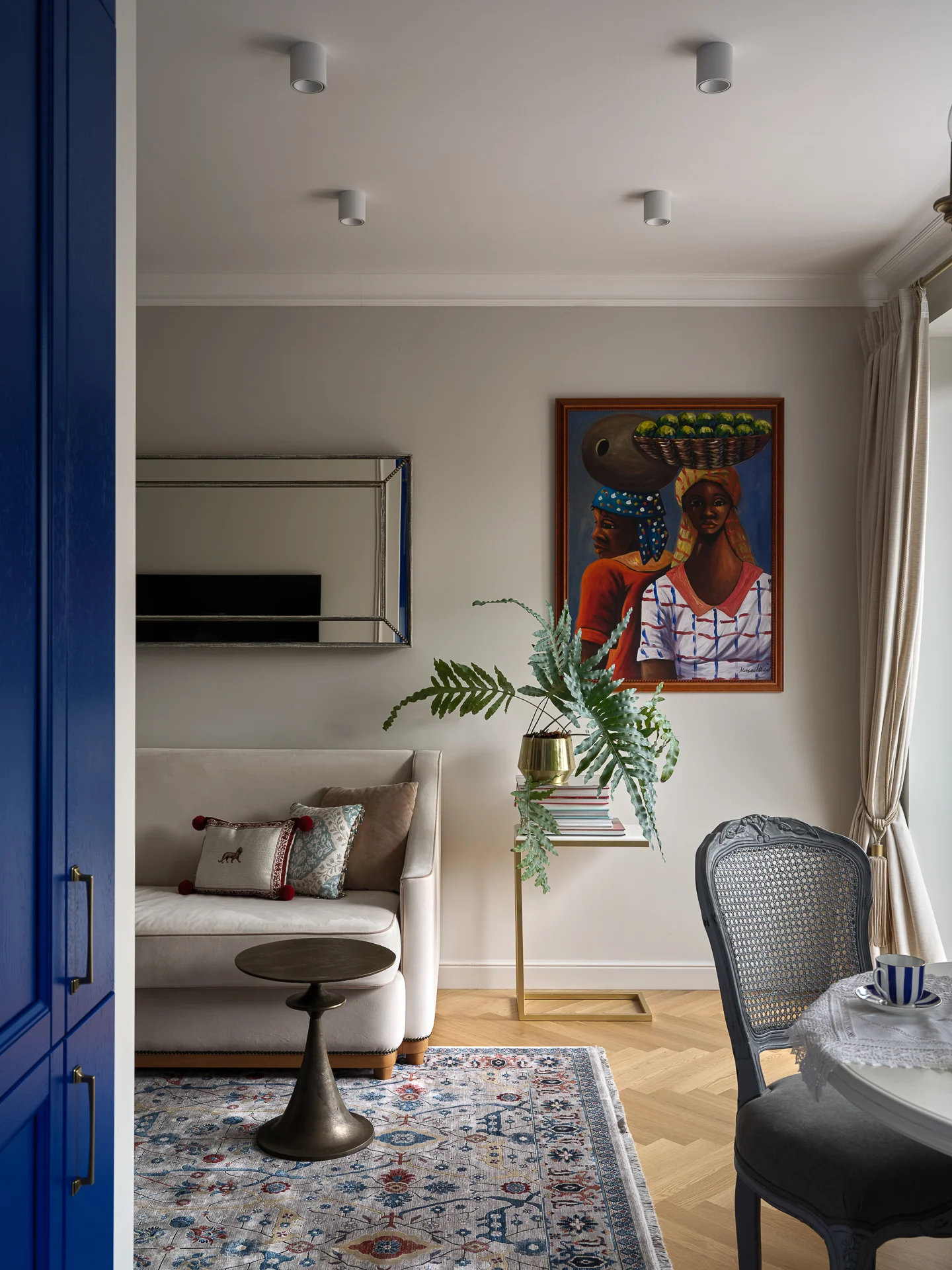 Картина на стене — из Доминиканской республики. Ее когда-то подарили хозяйке квартиры. Папоротник в золотистом горшке на подставке отлично дополняет этот уголок.
