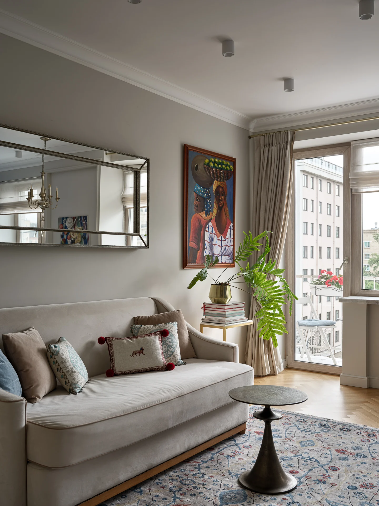 Диван раскладывается и при необходимости превращается в дополнительное спальное место. Зеркало над ним, сделанное на заказ, визуально расширяет гостиную и отражает солнечный свет из кухни.