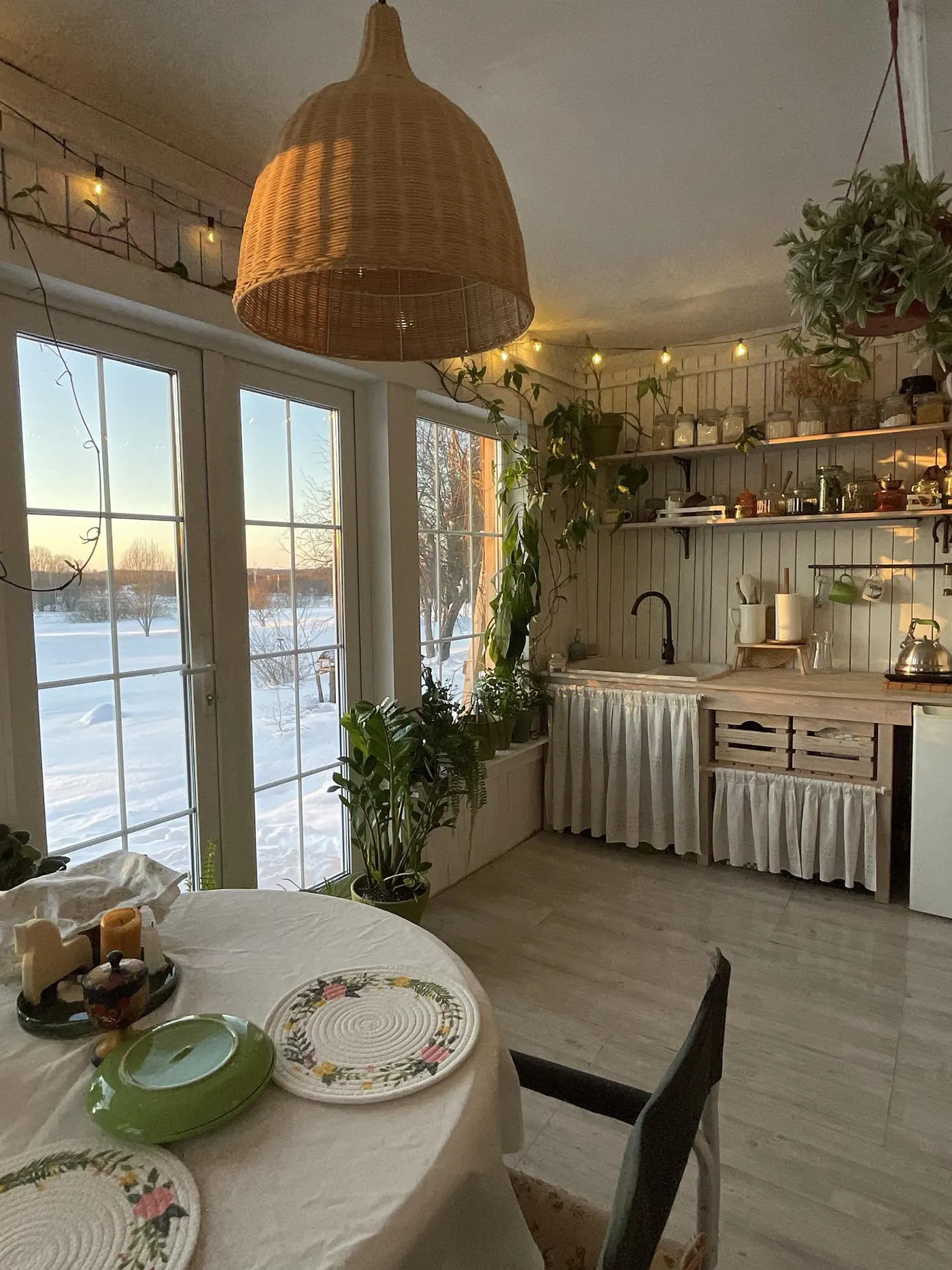 Кухня с панорамными окнами в старом деревенском доме