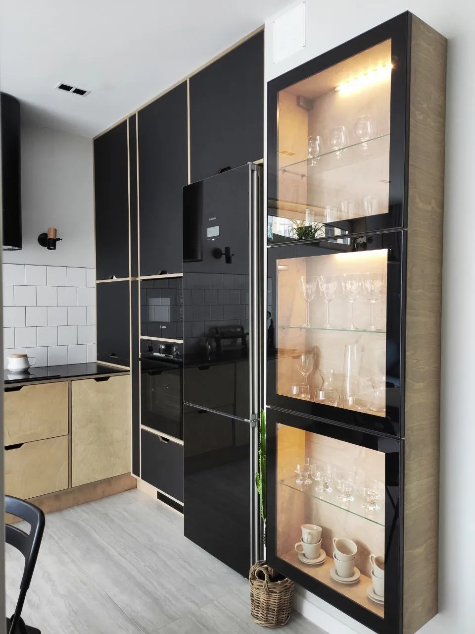 В дизайне использованы два цвета: светлое дерево и графитово-черный. Отдельное место выделено под встроенный шкаф-витрину для хранения посуды.