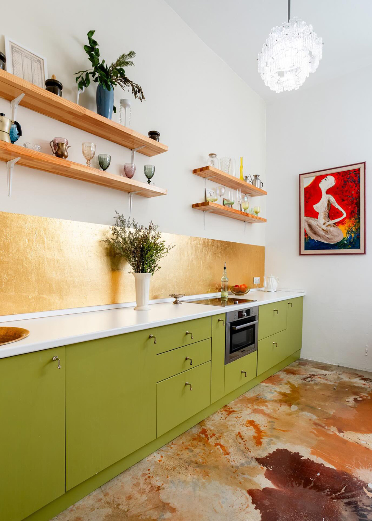 Еще совсем недавно эта кухня выглядела совсем иначе: белые шкафы и стены, ни намека на яркость. Но хозяйка перекрасила гарнитур в оливковый цвет и самостоятельно сделала интересный фартук из золотистой потали (имитация настоящего золота в виде тончайших листов или фольги).