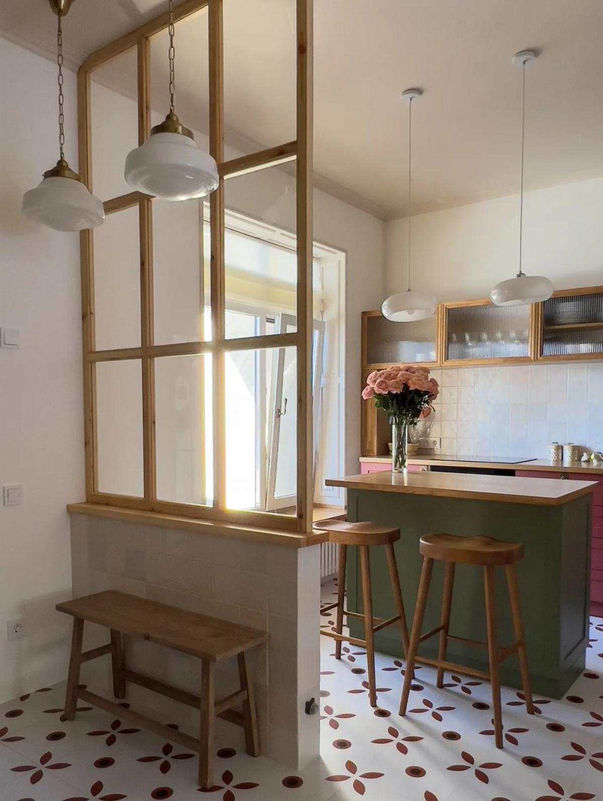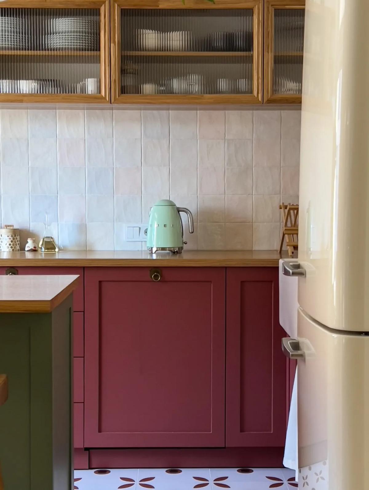 Такую яркую и харизматичную кухню в своей загородной квартире (точнее, двухэтажном таунхаусе) сделала супружеская пара из Караганды. Акцентная плитка на полу, оливковый кухонный остров вместо обеденного стола, деревянные барные стулья и пыльно-розовый гарнитур. Вот как это выглядит в жизни: