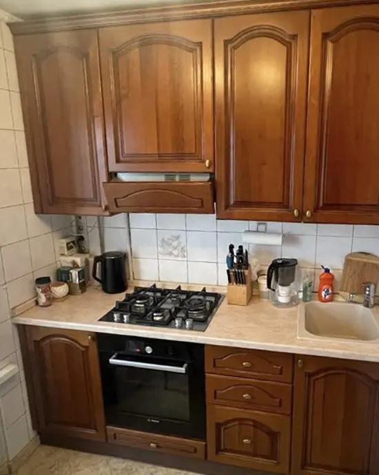 У владельцев этой квартиры в Подмосковье не было денег на полномасштабный ремонт. Но им очень хотелось обновить отдельные уголки своей хрущевки. Например, что-то сделать с массивным кухонным гарнитуром из 2000-х.