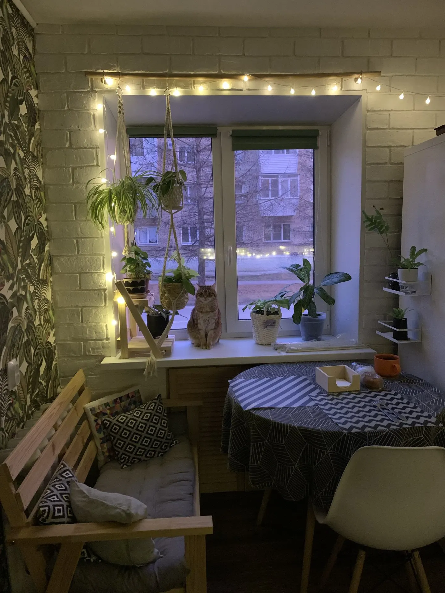 Интересные детали, которые можно взять на заметку для обустройства интерьера своей кухни: деревянная скамейка вместо стульев, подвесные кашпо, приставные полочки к холодильнику, декоративный кирпич в отделке.