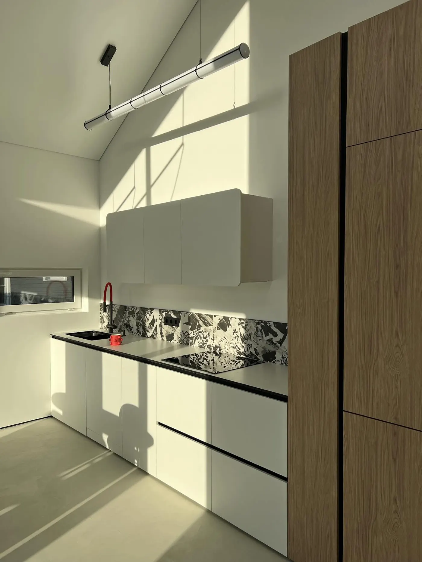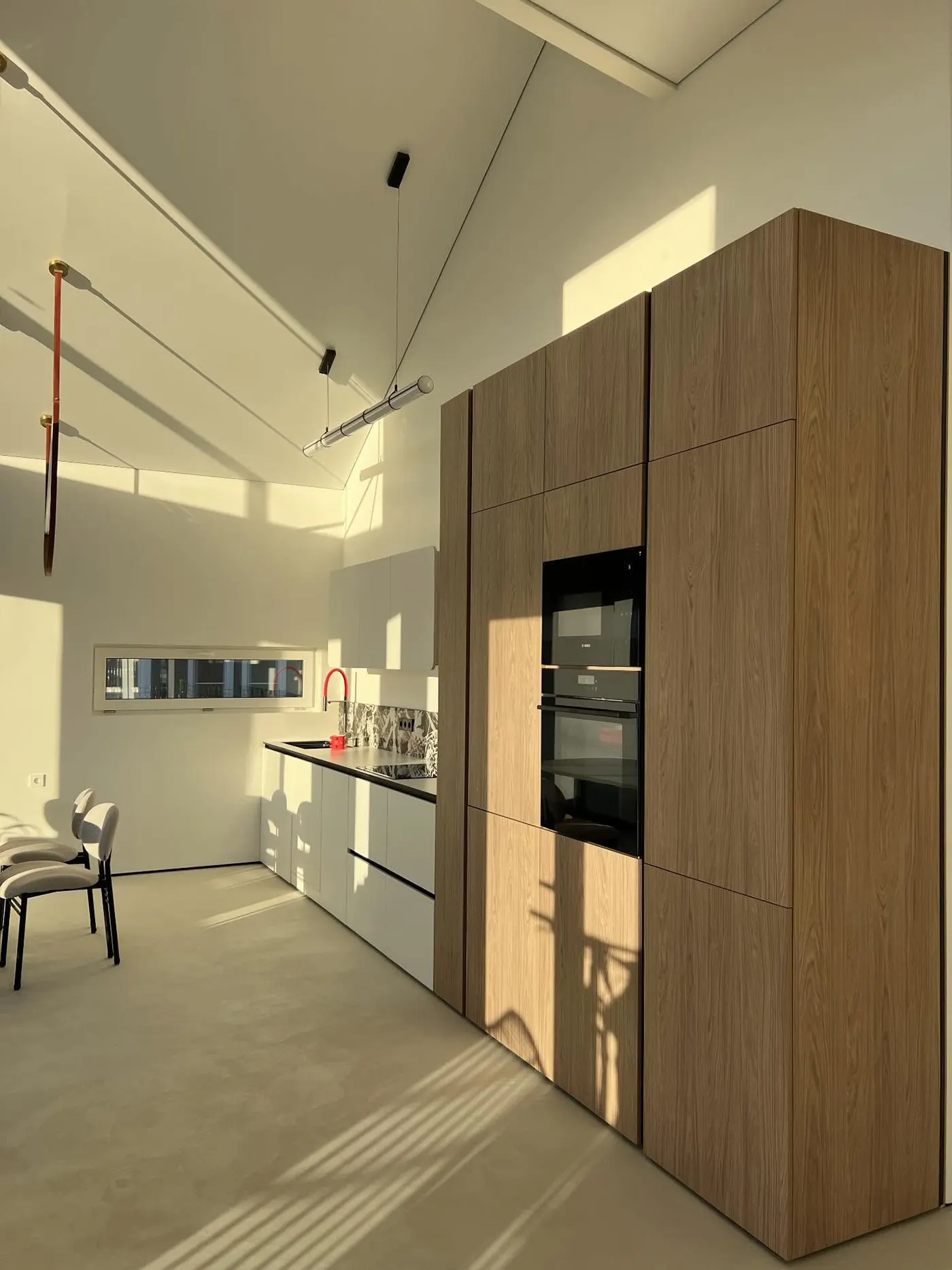 Минималистичный цвет кухонного гарнитура подчеркивается шкафами из светлого дерева. Но особенно в глаза бросается красный смеситель, который перекликается с лампой над обеденным столом.