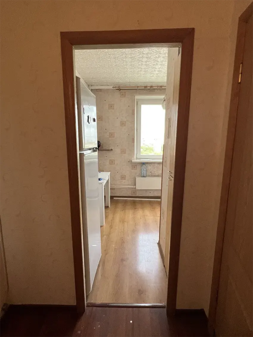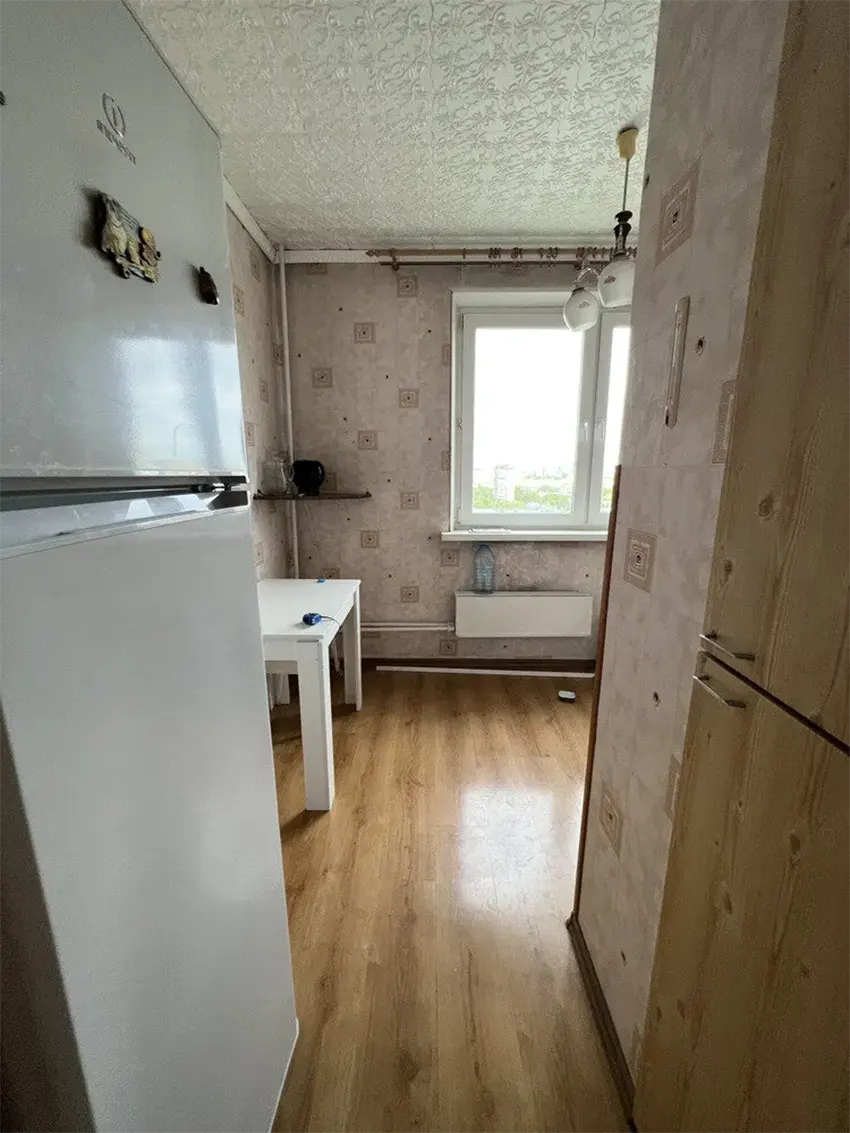 Холодильник стоял рядом с дверным проемом и визуально утяжелял скромную кухню.