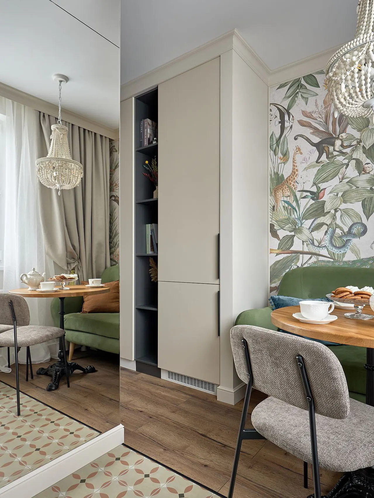 2. Зеркало в необычном месте. Вентиляционная шахта — боль для многих квартир в старом фонде (особенно в панельках, построенных в 1980-х годах). В этой однушке благодаря задумке дизайнера она стала инструментом, который визуально расширил пространство.