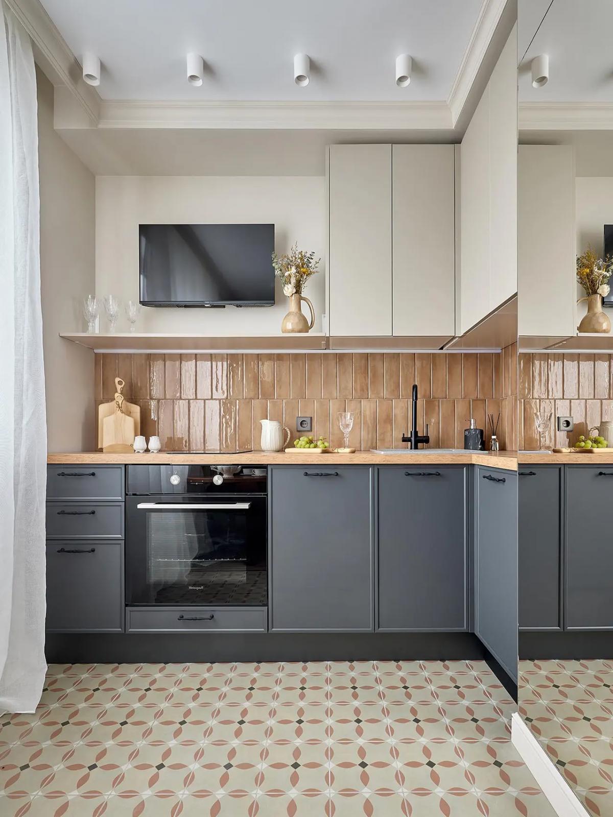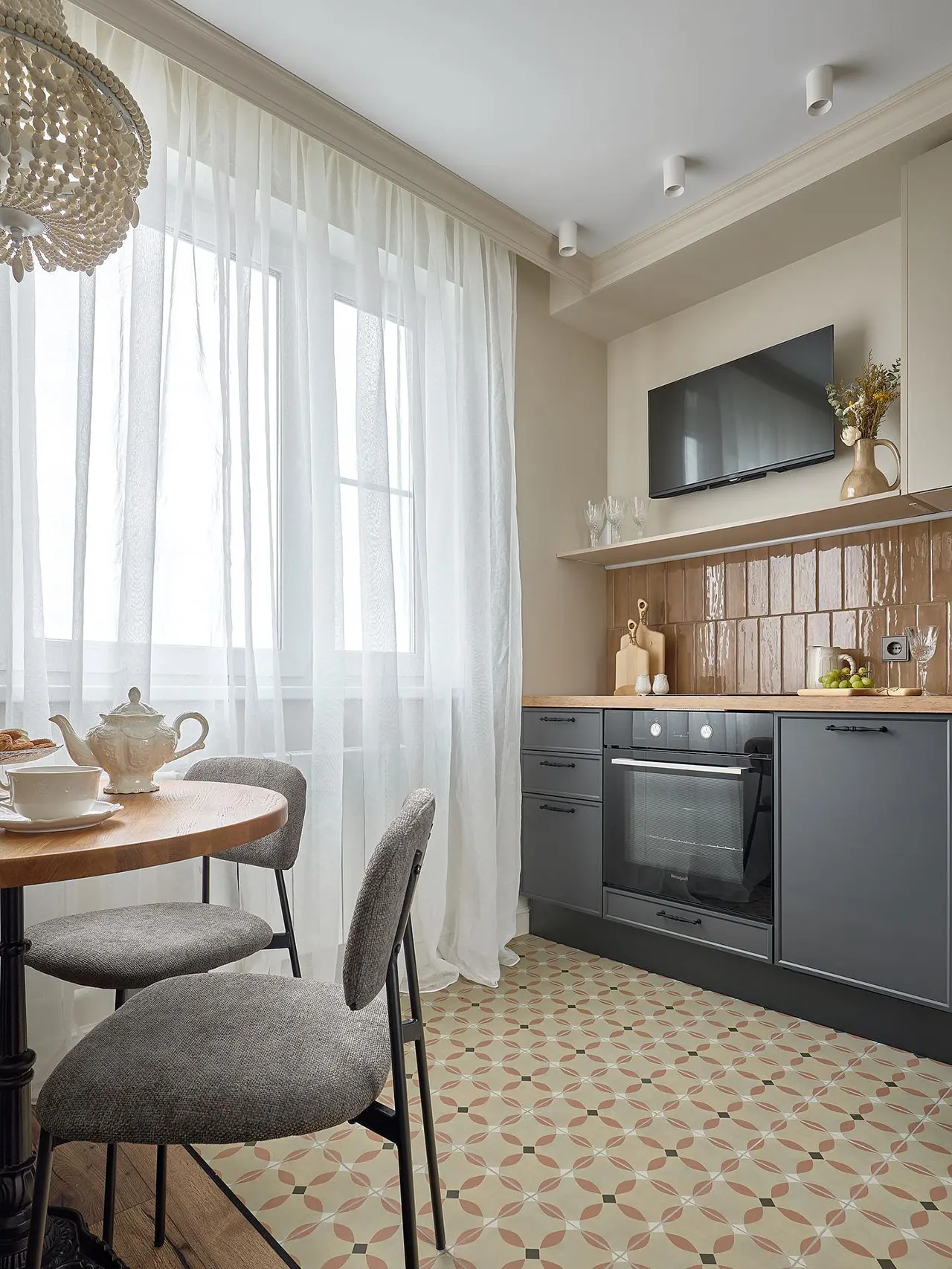 Вместо вытяжки — телевизор. Одно из самых спорных решений, но иначе телевизор сложно было вписать на кухню.