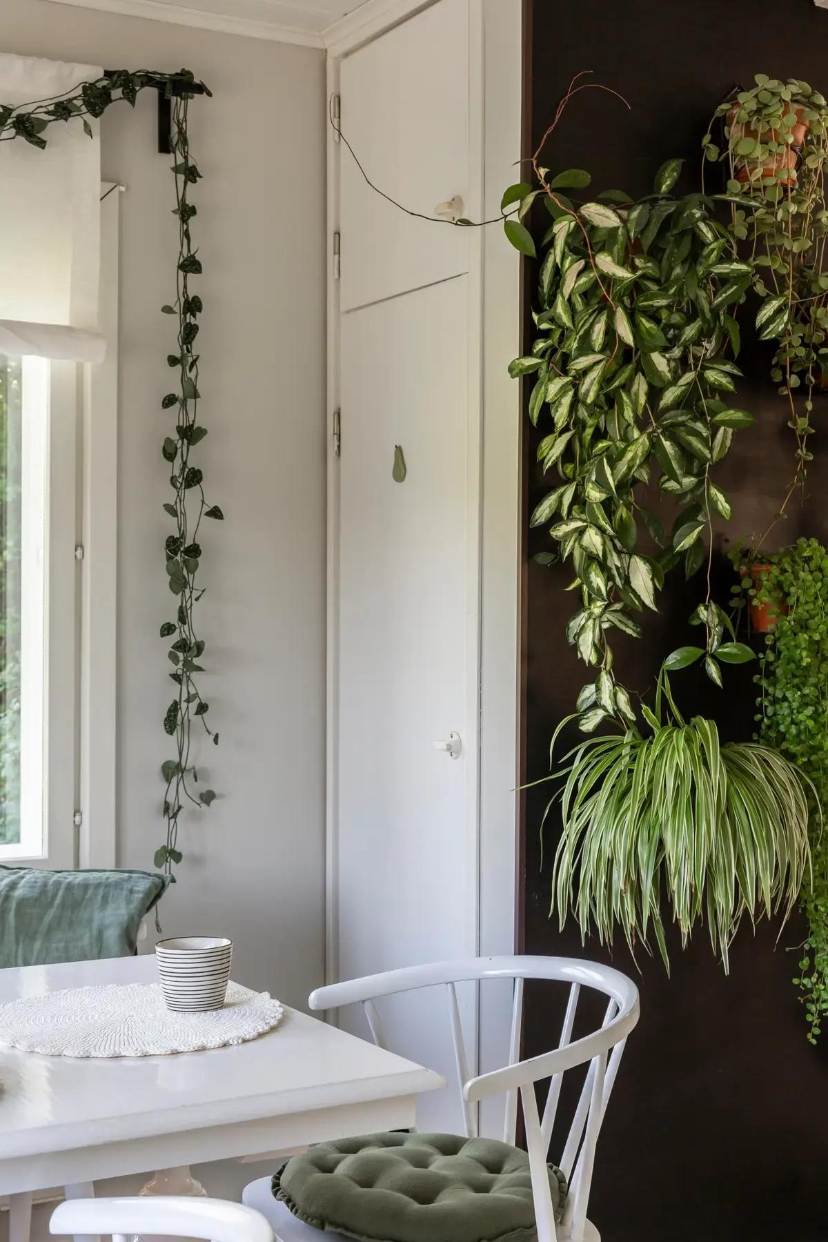 Боковую стену шкафчика хозяйка приспособила под цветы и растения. Цветочные горшки закреплены на вертикальные кронштейны. Этот прием, по словам Кати, позволил освежить интерьер.