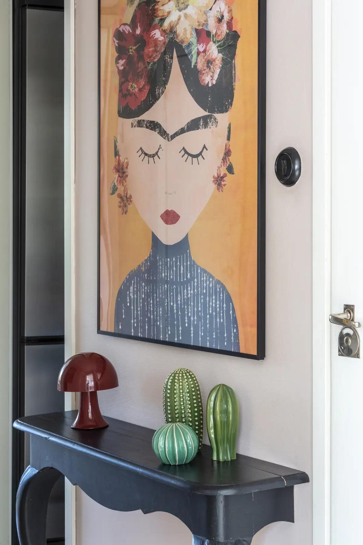 Например, на стене в коридоре можно увидеть портрет Фриды Кало. Хозяйка купила его в магазине постеров. Керамические кактусы на консоли — из IKEA.