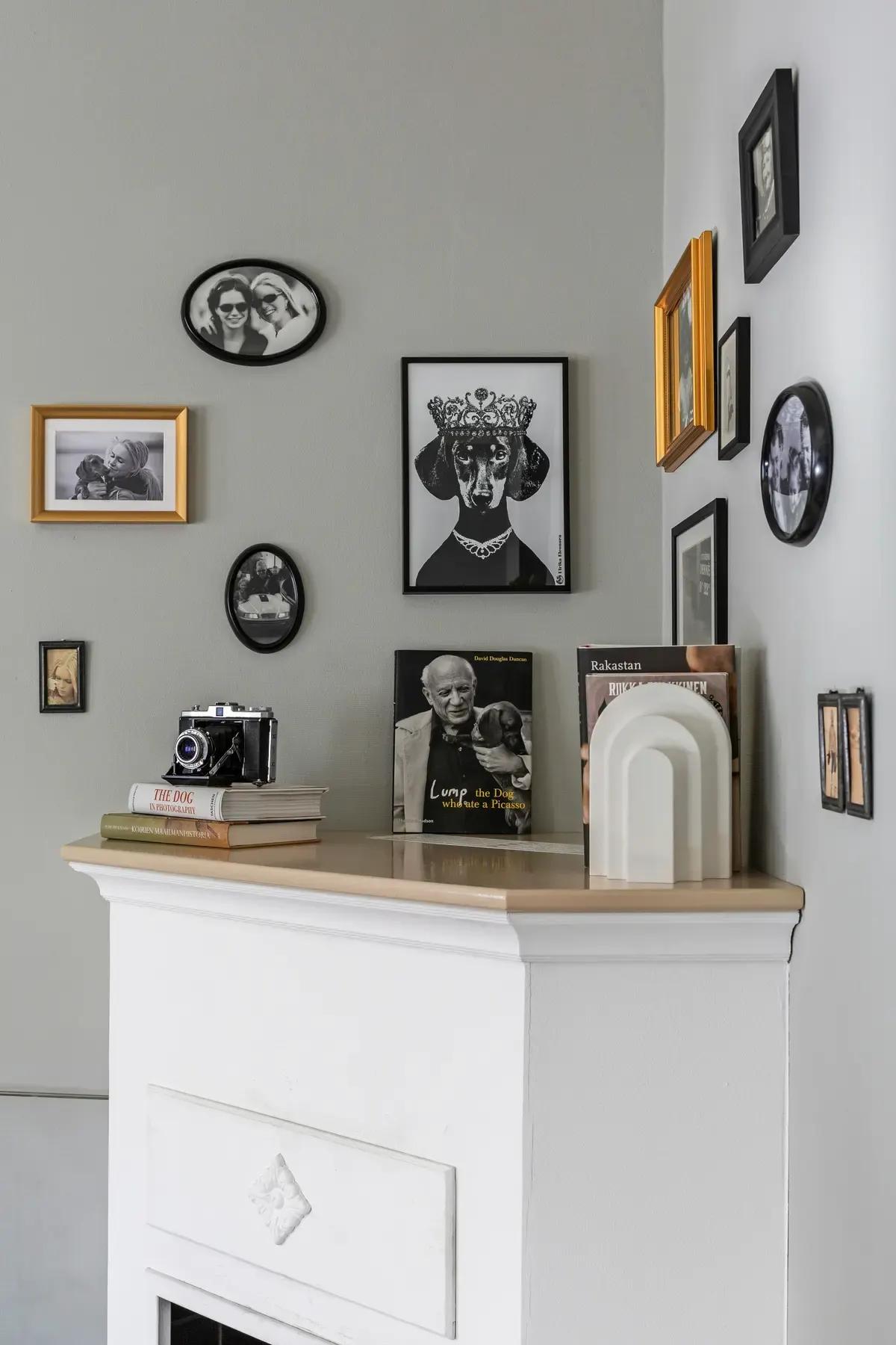 Уголок над камином в столовой превратили в стену воспоминаний. Здесь висят семейные фотографии и картина с таксой — она посвящена самой первой таксе, которая когда-то жила в семье Кати и Осмо.