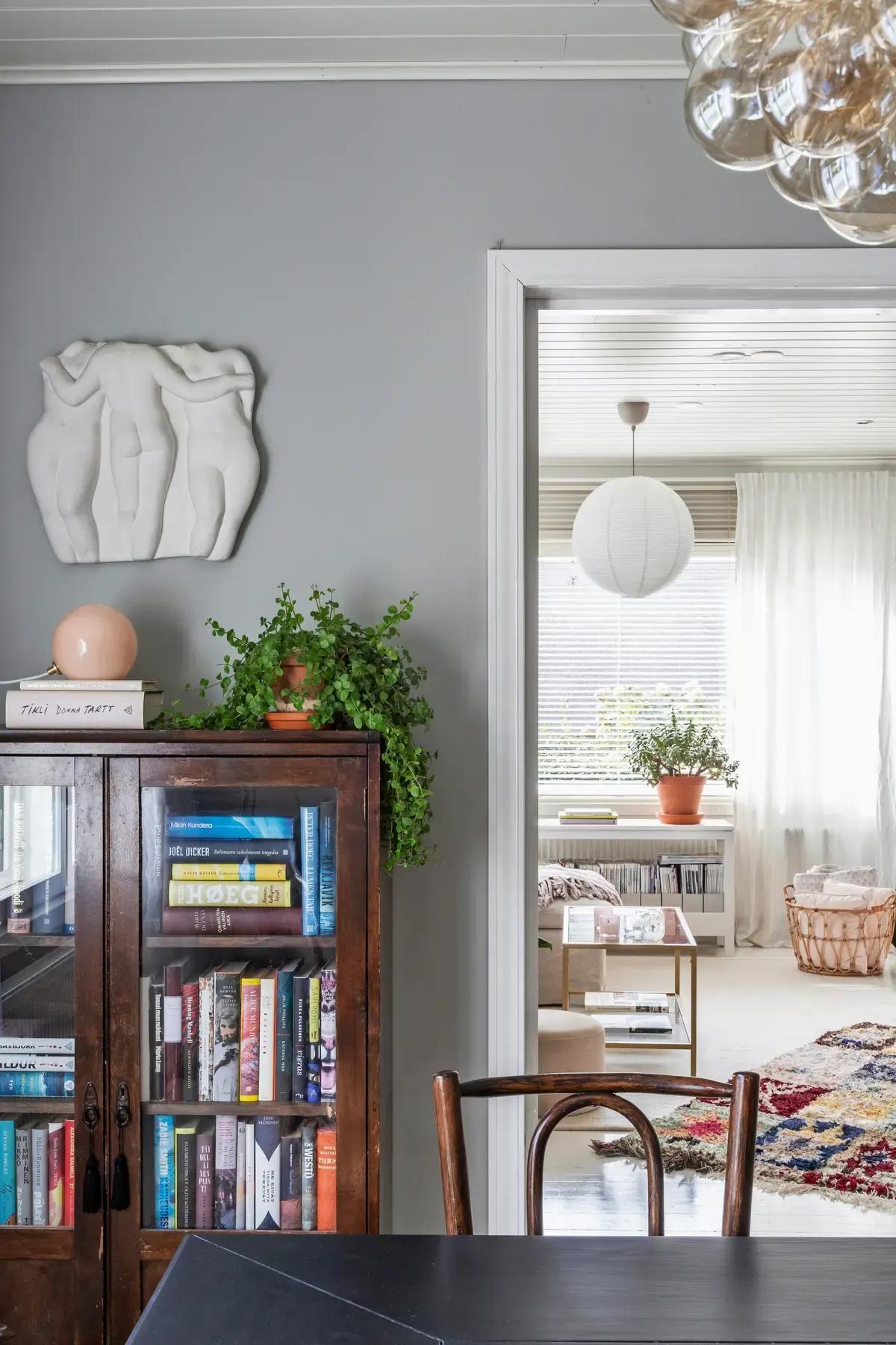Отдельной библиотеки в доме нет, но небольшой книжный стеллаж (его купили в комиссионном магазине) разместили между столовой и гостиной. Над шкафом висит необычная гипсовая фигурка, которую хозяевам когда-то подарили родители Осмо — теперь это своеобразная семейная реликвия.