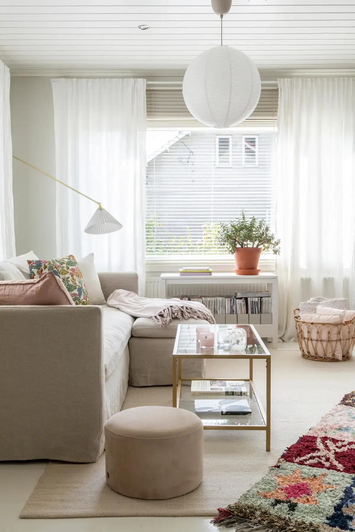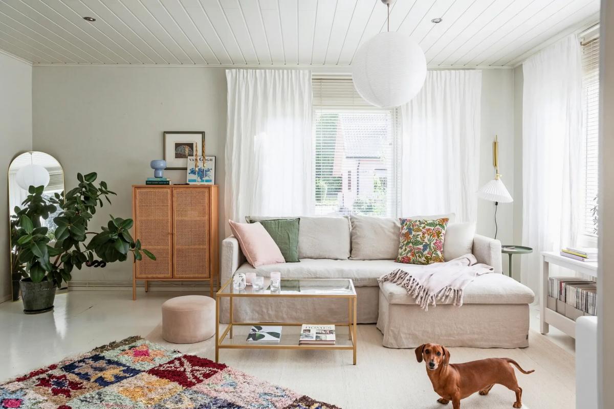 Просторная гостиная оформлена в светлых тонах. Даже чехол для дивана и ковер под ним — едва заметного молочного цвета. И лишь несколько деталей добавляют яркости в эту скандинавскую комнату: еще один ковер, растение, несколько цветных диванных подушек и декор на комоде.