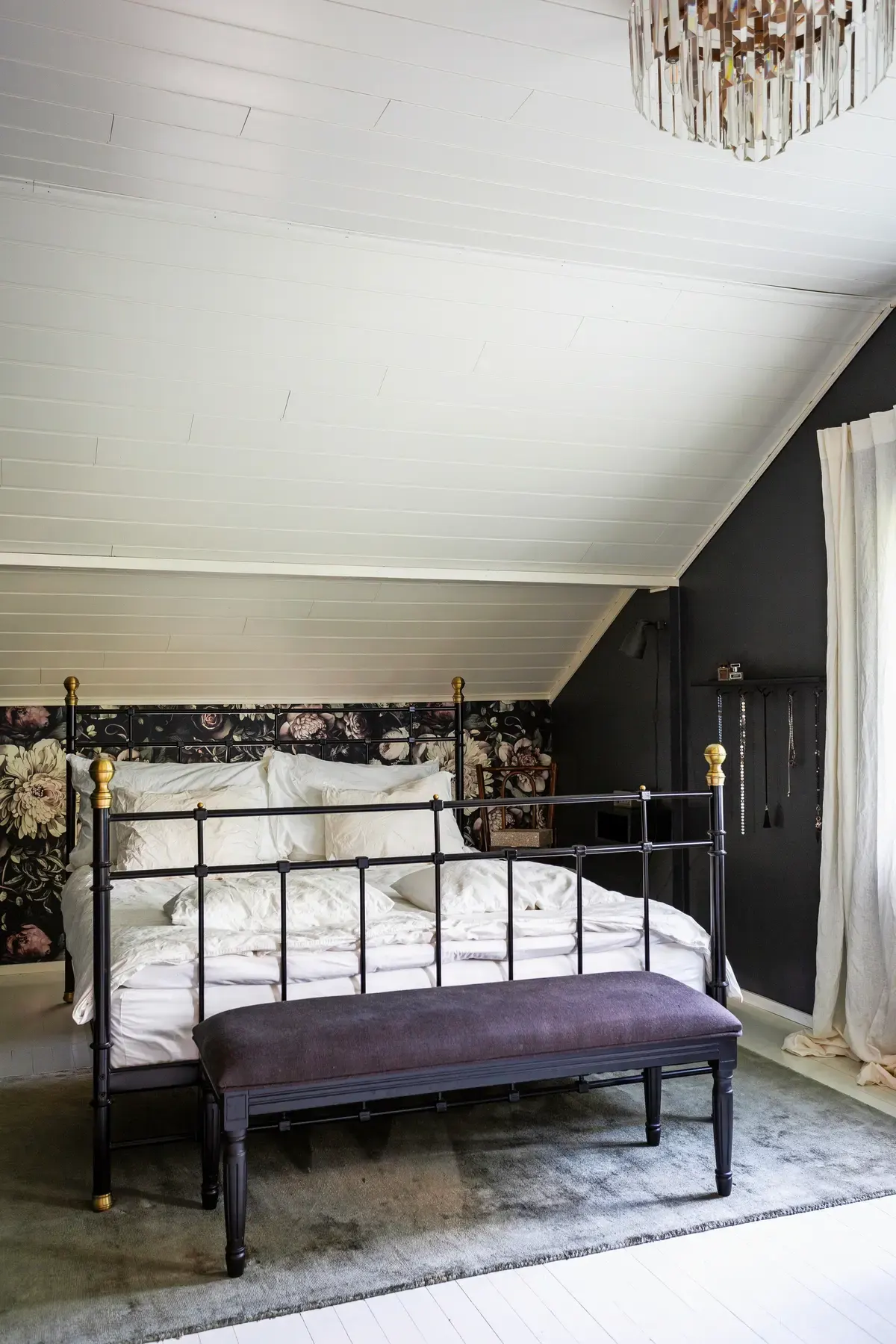 Для главной спальни Кати и Осмо выбрали акцентные обои с розами на черном фоне от Ellie Cashman Design. Другие стены выкрашены в черный цвет. Но, несмотря на такие темные оттенки, комната не выглядит мрачной благодаря подбору декора и текстиля. Светлые шторы и белое постельное белье вносят спокойные скандинавские мотивы в интерьер спальни.