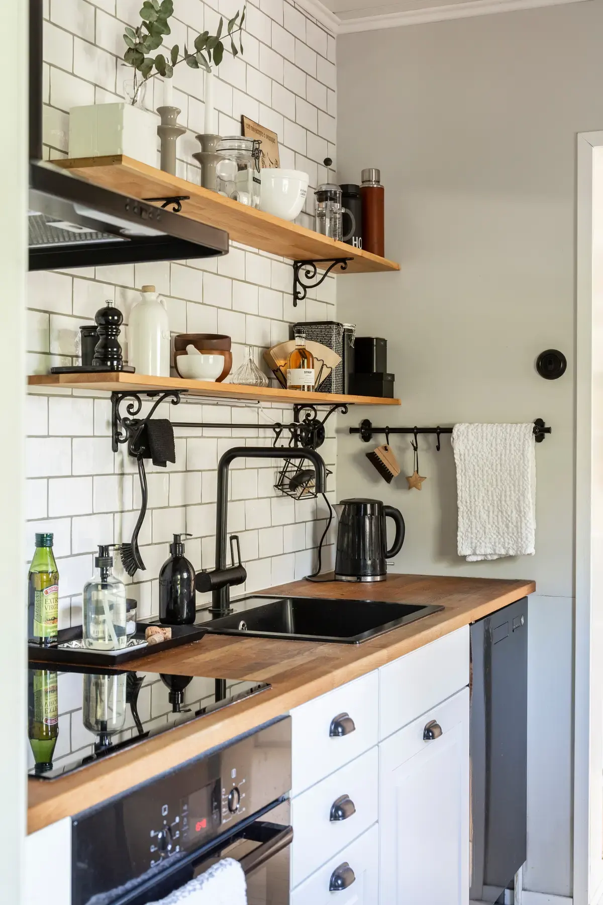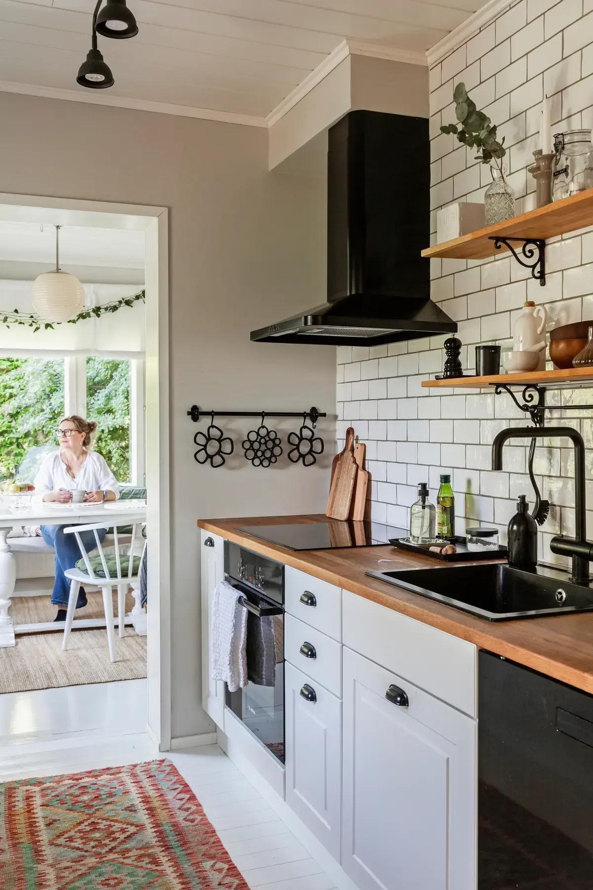 Совет от хозяйки: при обустройстве кухни лучше не использовать черные раковины и деревянные столешницы, потому что их трудно чистить.