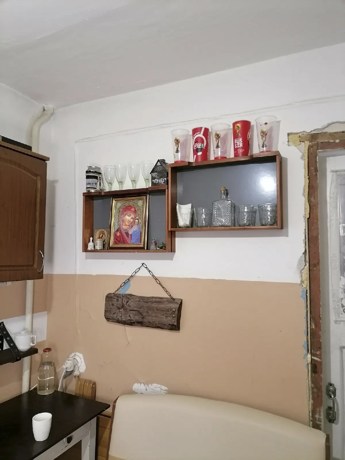 Например, самовар и советский поднос с хохломской росписью, который хозяйка купила за 100 рублей на барахолке. Или самодельная полка со стаканами под стеклоблоками.