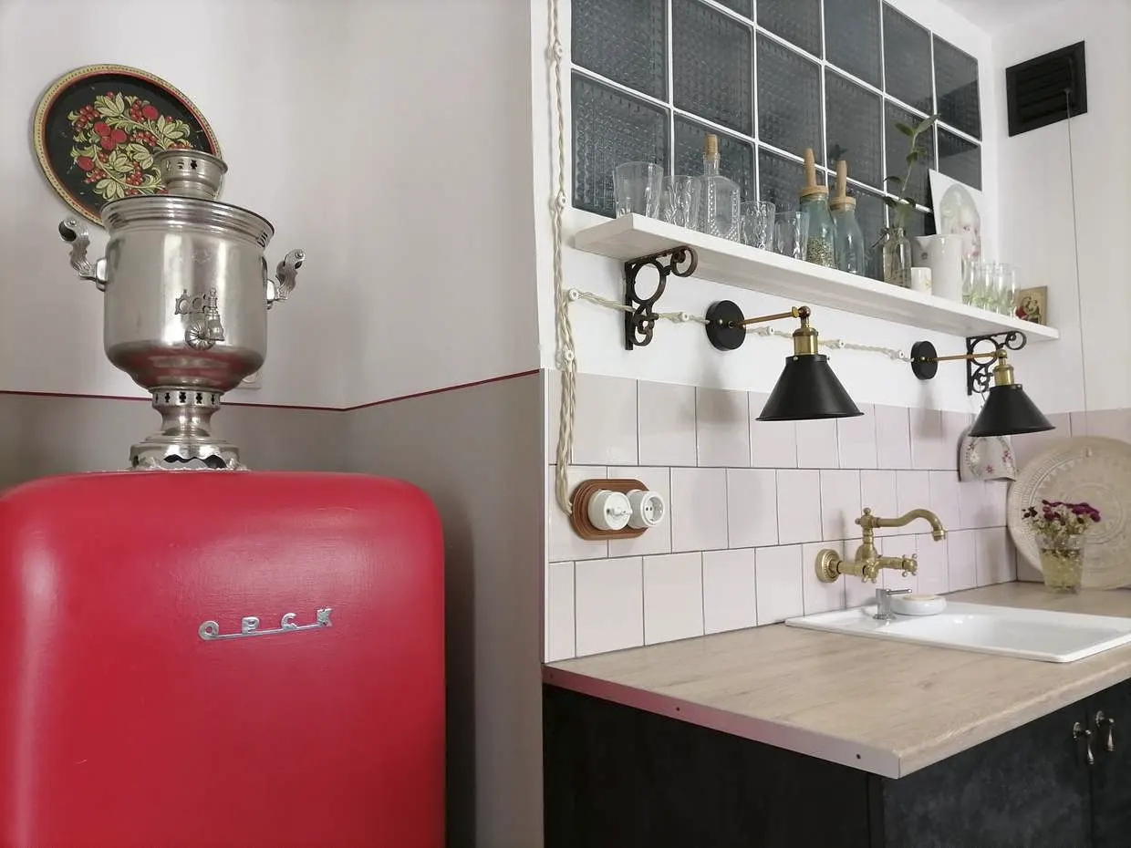 Советский холодильник 1964 года стал ярким акцентом в интерьере. Катя покрасила фасад в красный цвет — и теперь он выглядит не хуже модного SMEG.